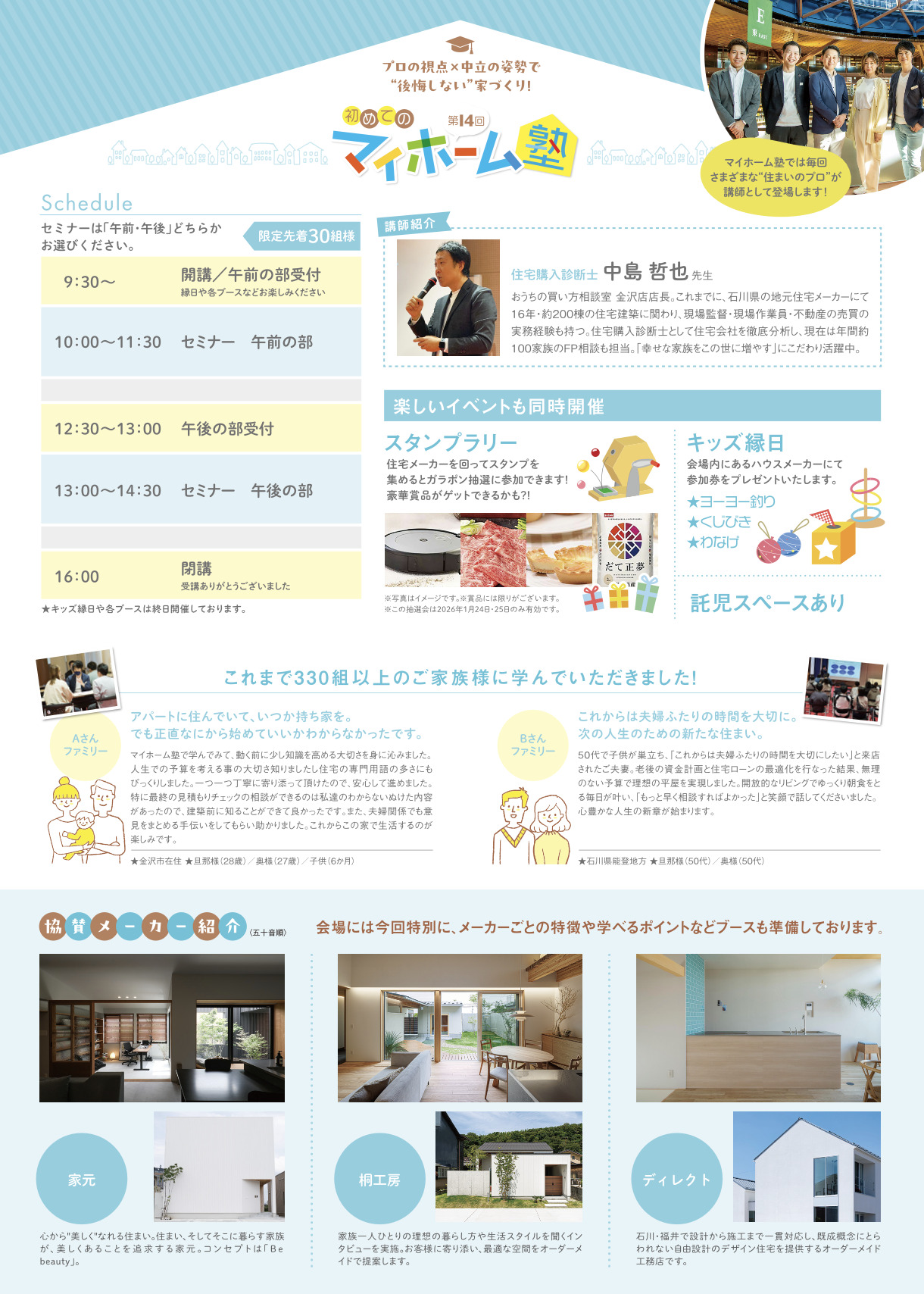 毎回好評のため、予約席が早期に埋まる受講料無料・楽しいイベント盛りだくさんの「マイホーム塾」。